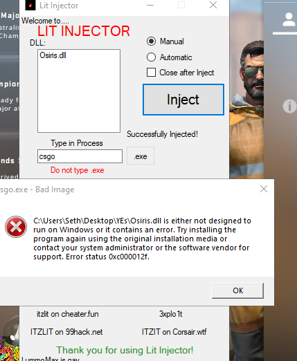 ​​​​not working when i injected it says csgo.exe bad image error plz help me